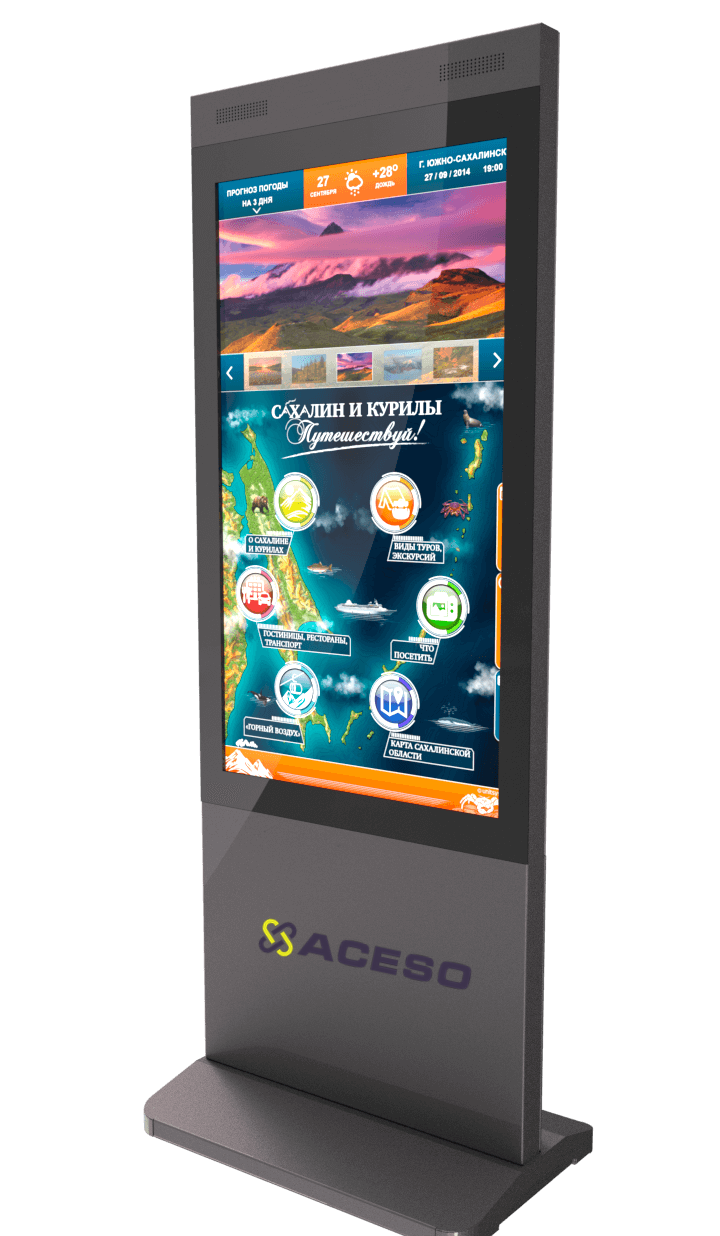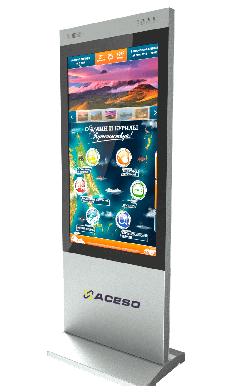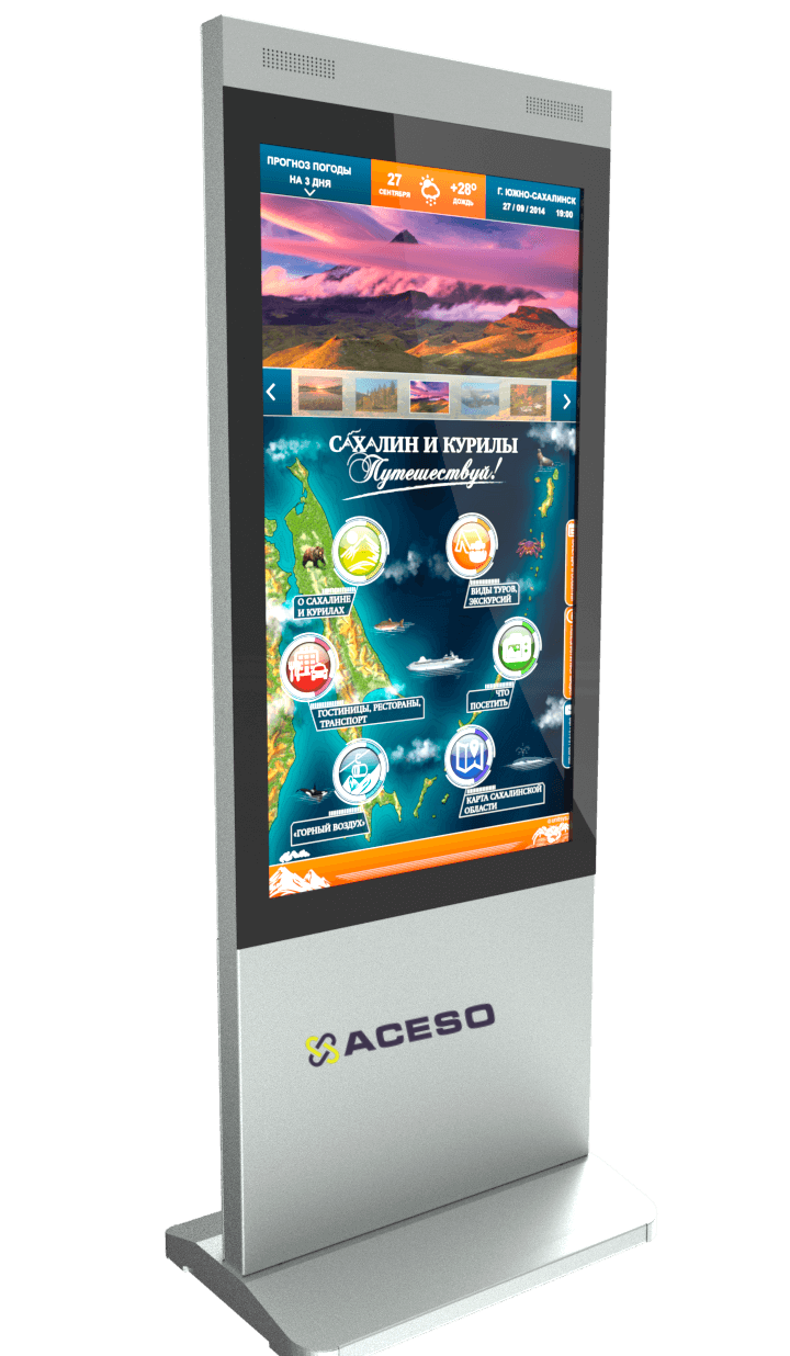 Мультифункциональный терминал легко справится с разноплановыми задачами: наглядно продемонстрирует любой материал – фото-, видео- и аудиосодержания; выполнит навигационную функцию; проведет вместе с Вами виртуальную экскурсию; выведет на экран новостную, справочную, историческую и прочую ознакомительную информацию и т.д. Полный перечень функций интерактивного решения весьма широк, и напрямую зависит от программного обеспечения, которое Вы выберете для своих целей.